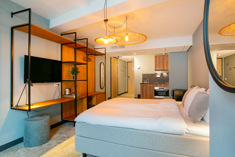 De Deluxe Studio met Keuken is uitgerust met alle benodigdheden en faciliteiten die je van een luxe 4-sterrenhotel mag verwachten. Van de 69 hotelkamers hebben er 34 een eigen keuken met koelkast, multifunctionele magnetron/oven en elektrisch fornuis met afzuigkap, waardoor ze uitermate geschikt zijn voor een kort en lang verblijf.